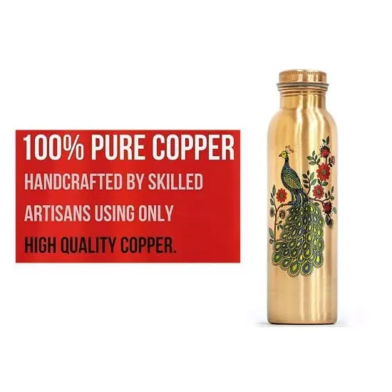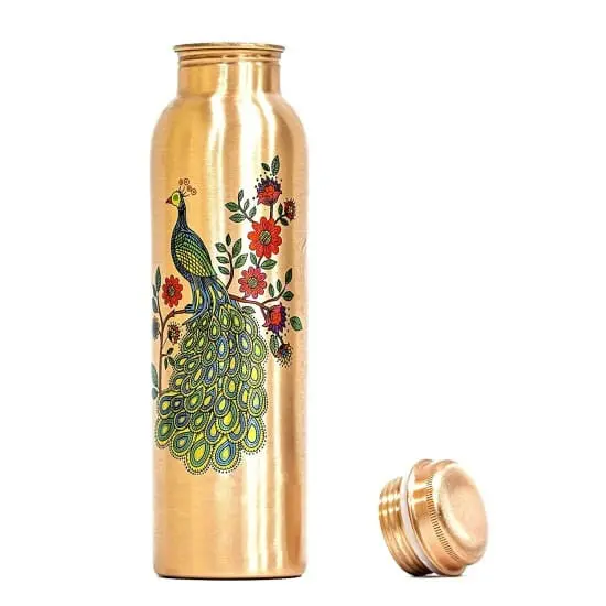AYURVEDACOPPER Peacock Printed Lacquer Coated Pure Copper Water Bottle (1 Liter)