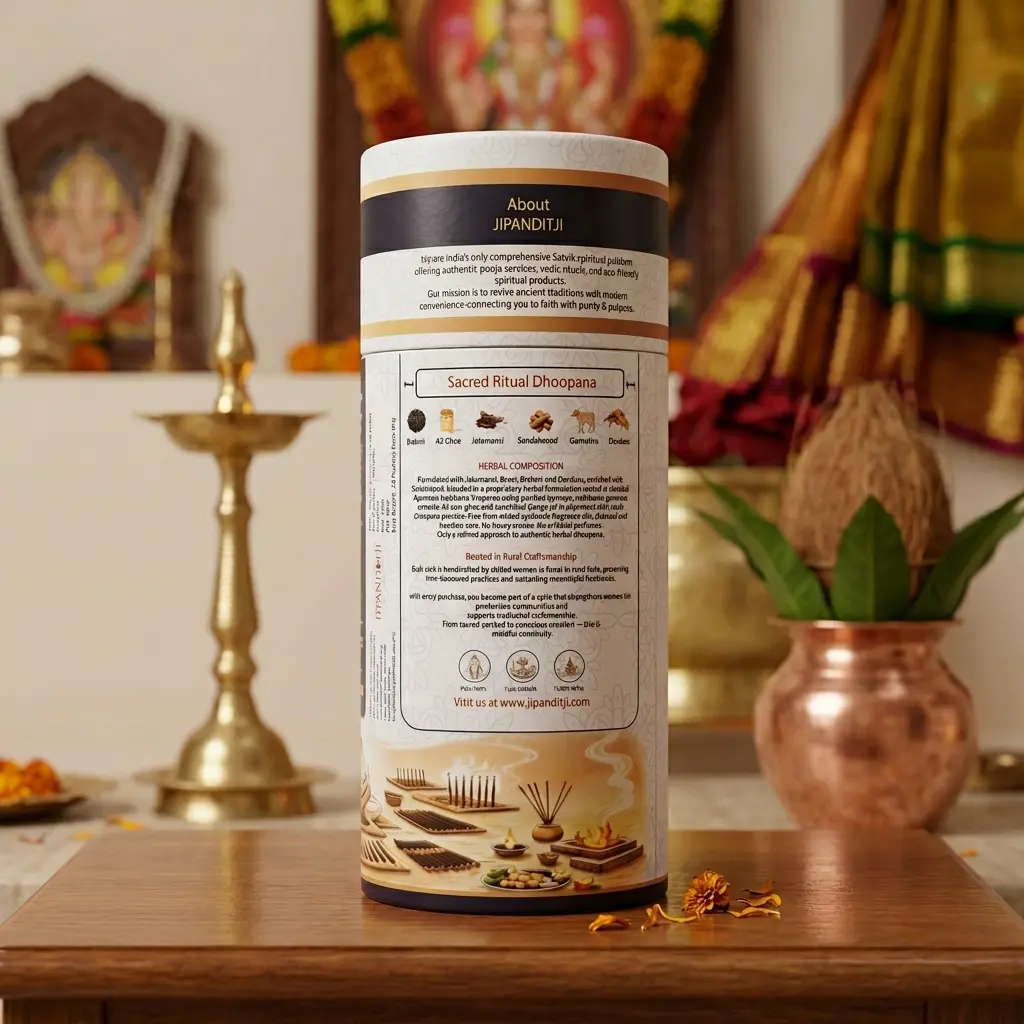 Made using A2 cow ghee, gomutra essence, gomaya and Ganga jal — rooted in authentic Vedic dhoopana practices.