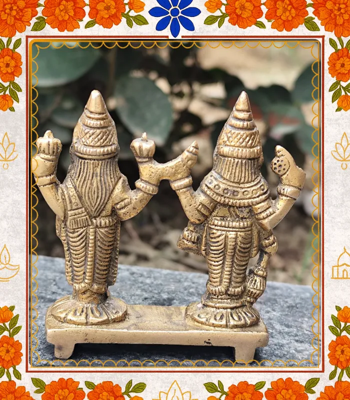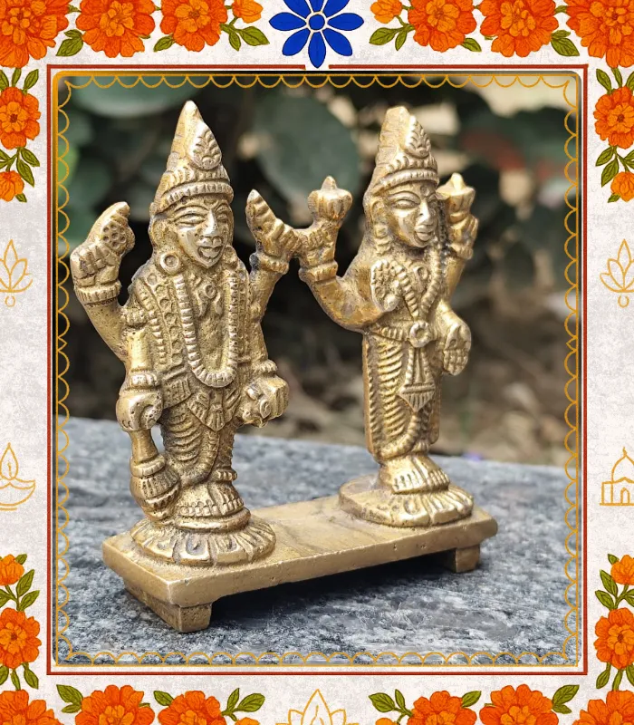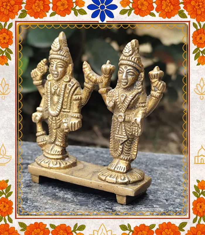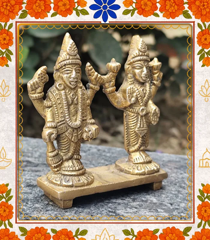 Invite divine grace, abundance, and balance into your home with this elegantly crafted Brass Laxmi Narayan Idol. Representing the union of Goddess Lakshmi (Goddess of wealth) and Lord Vishnu (Protector and Preserver), this sacred idol is a symbol of fortune, harmony, and spiritual progress.  Handcrafted from premium solid brass with a rich antique finish, this idol showcases Lord Narayan and Goddess Lakshmi seated together, radiating serenity, strength, and compassion. Perfect for your home mandir, office, or meditation space, this divine pair brings balance between material success and spiritual growth.  Whether you’re performing daily puja or seeking vastu correction, the presence of Laxmi Narayan Ji uplifts the energy of the entire space with positivity and divine blessings.