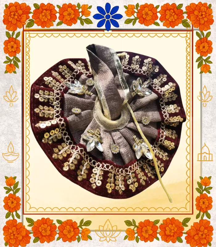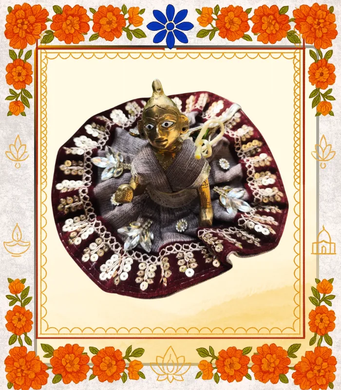 Grace your beloved Thakur Ji with this Maroon Designer Ladoo Gopal Dress, crafted with devotion and detailed artistry. The rich maroon border paired with shimmering brown fabric symbolizes royalty, dignity, and spiritual warmth—perfect for both daily darshan and festive celebrations.