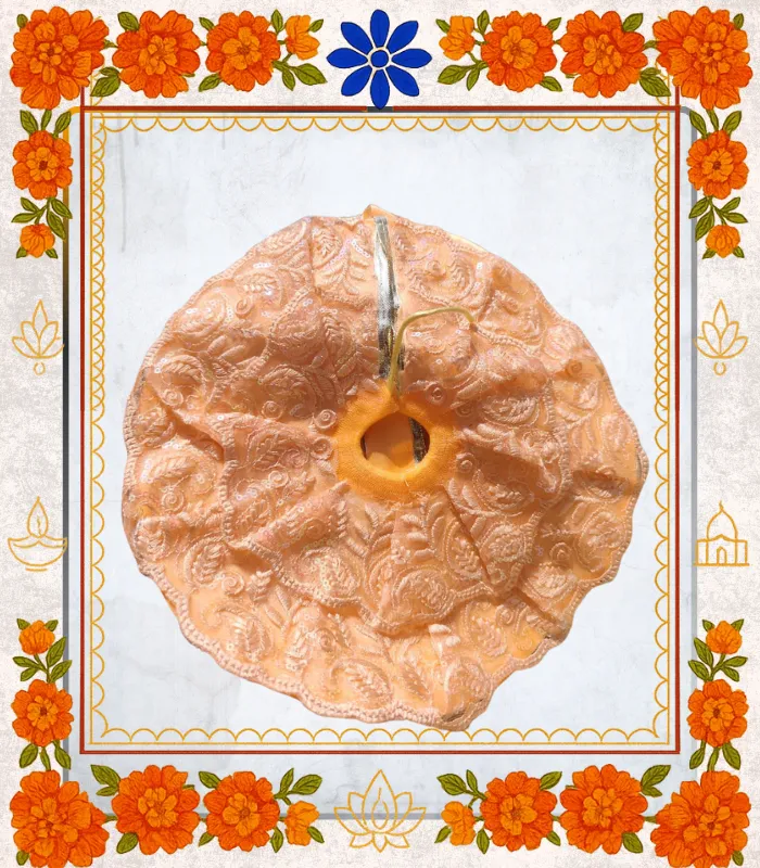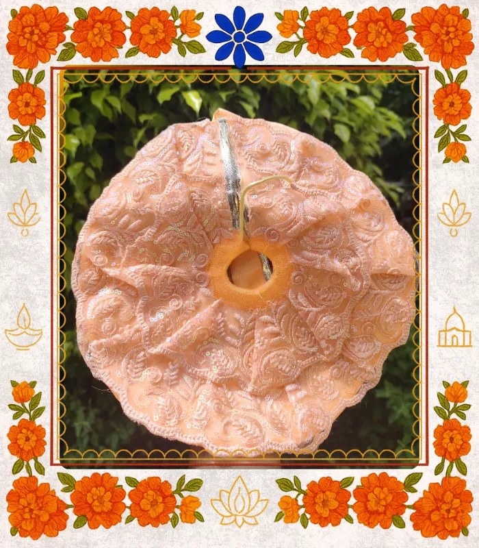 This poshak features delicate thread embroidery adorned with shimmering sequins, giving it a graceful and radiant look. The elegant circular fan-style design enhances the beauty and presence of your deity.